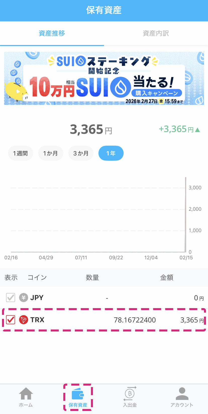 取引を完了させると、“保有資産”メニューでTRXの保有量が反映されているのが確認できます。