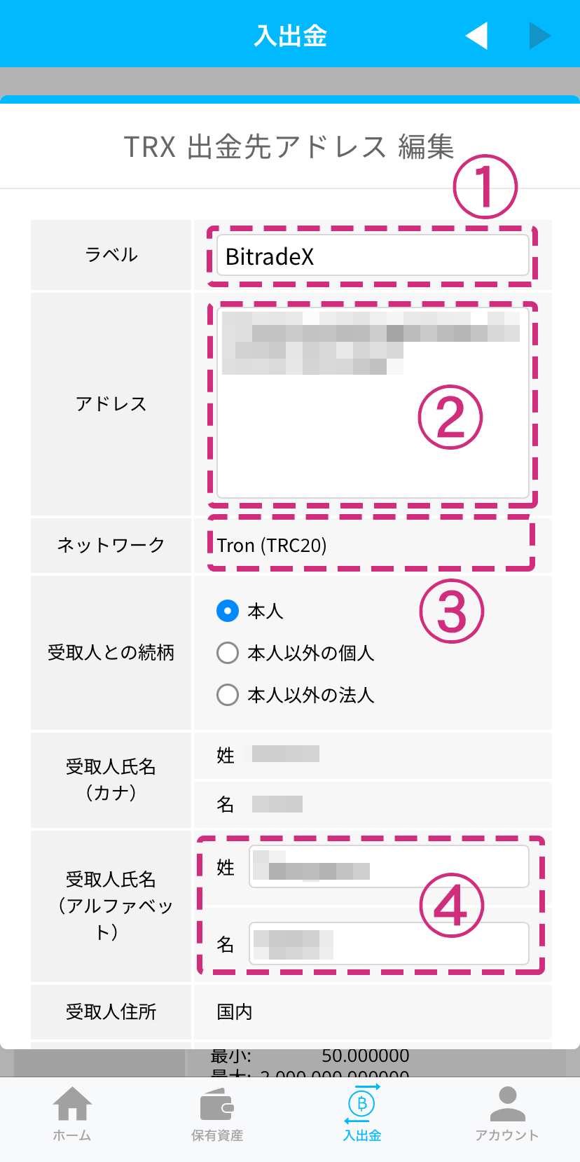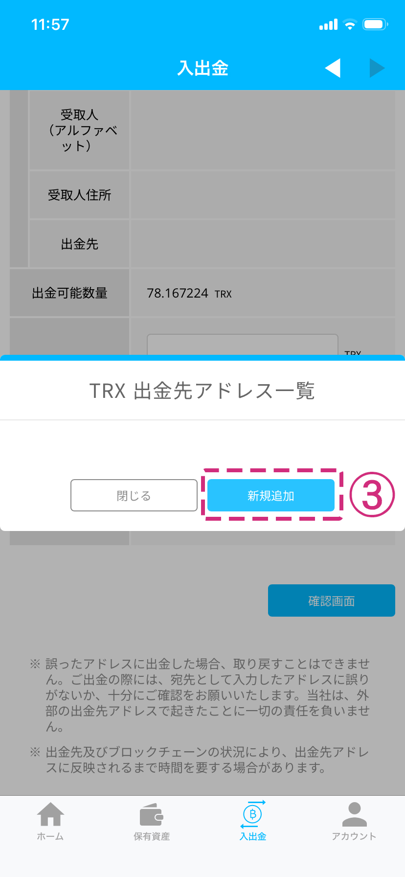 ③ “新規登録”をタップし、TRX出金先アドレス一覧にBitradeXのアドレスを登録します。