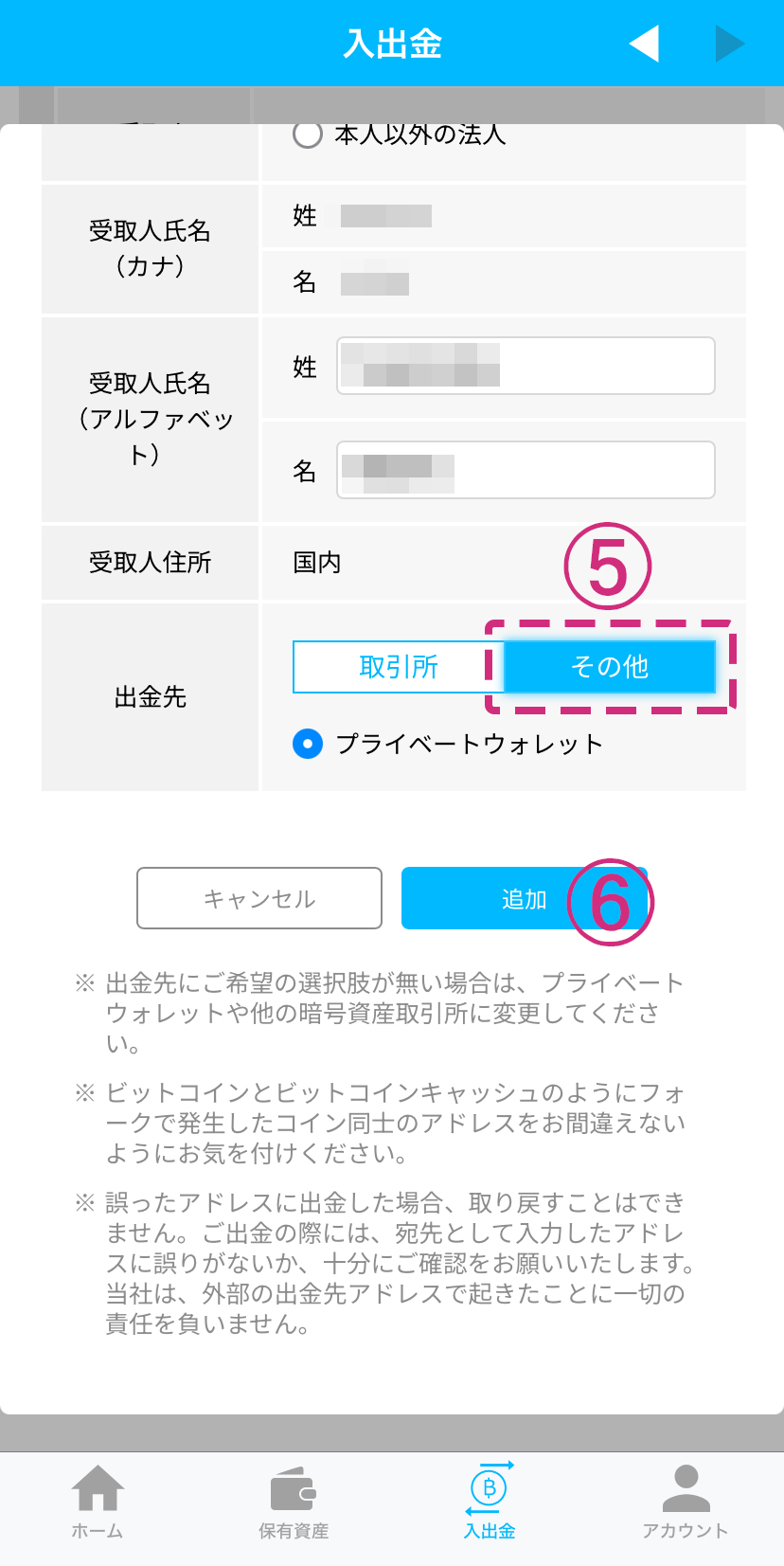 ⑤ 出金先は“その他”(プライベートウォレット)を選択します。