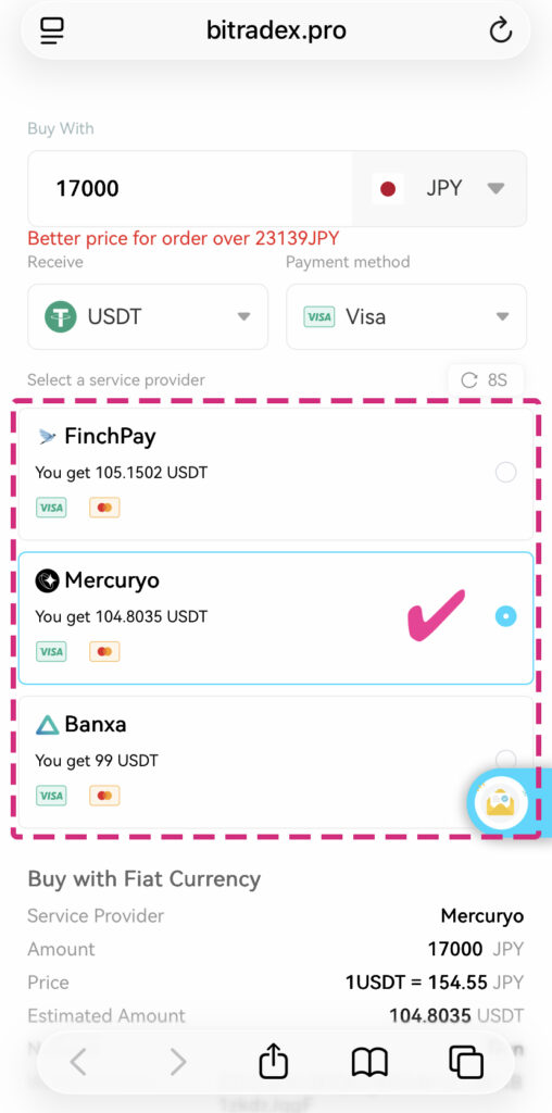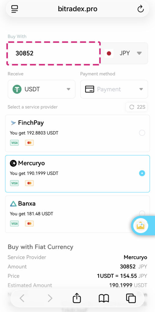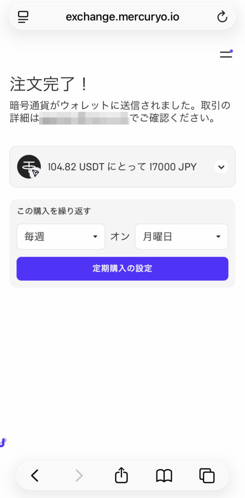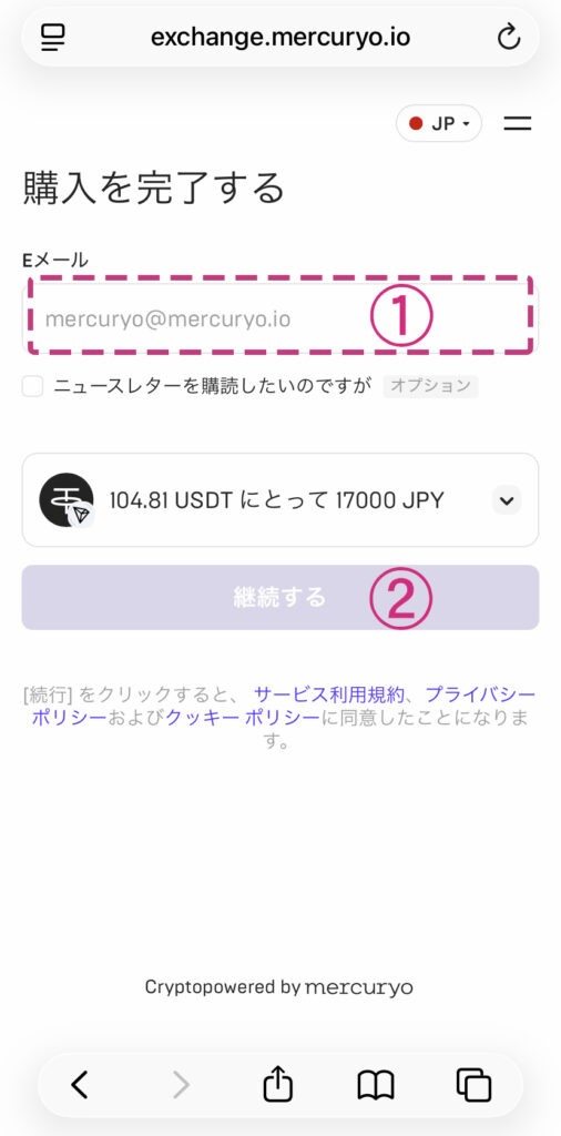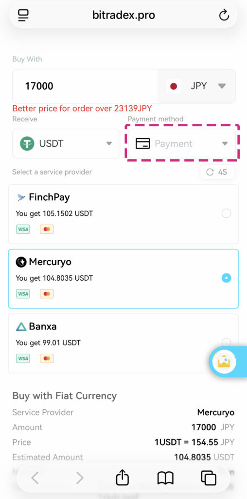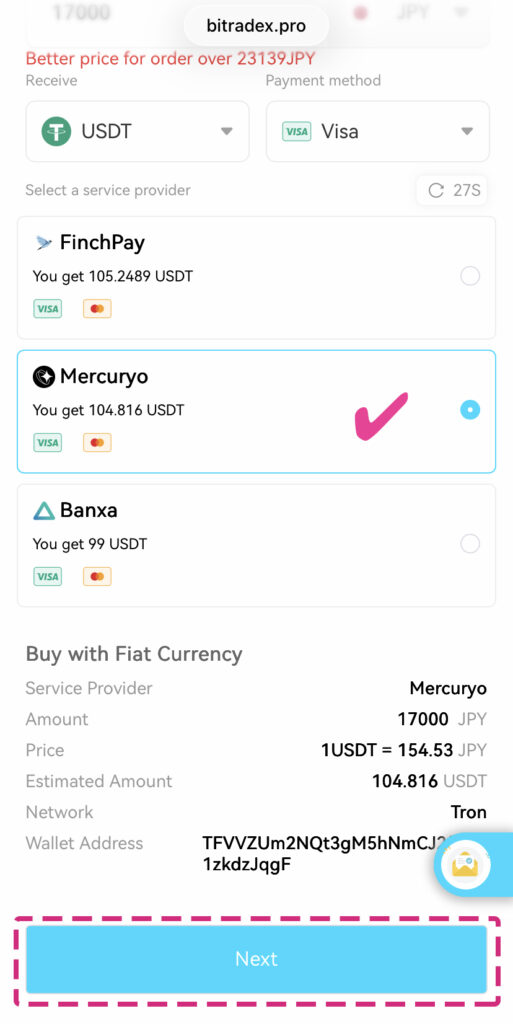 サービスプロバイダに“Mercuryo”を選択すると、取引の概要が表示されます。