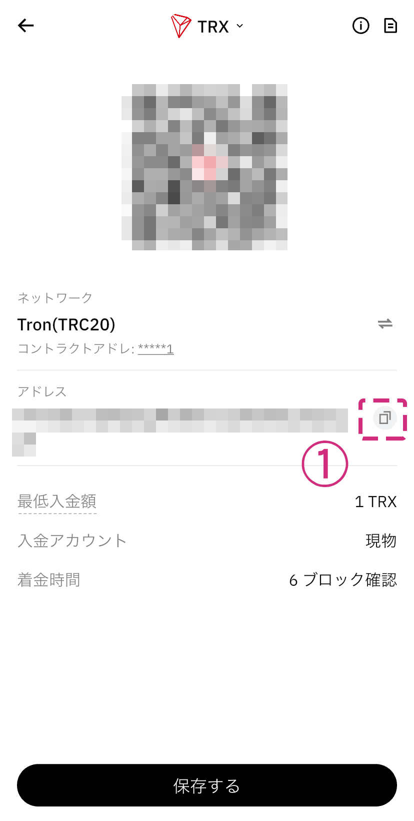 ① 入金口座アドレス右側の“コピー”ボタンをタップして、入金アドレスをクリップボードにコピーしておきます。