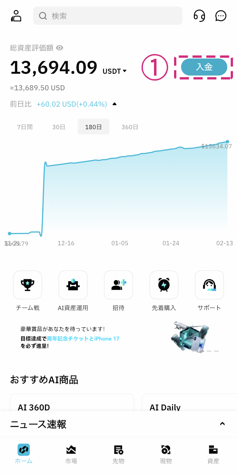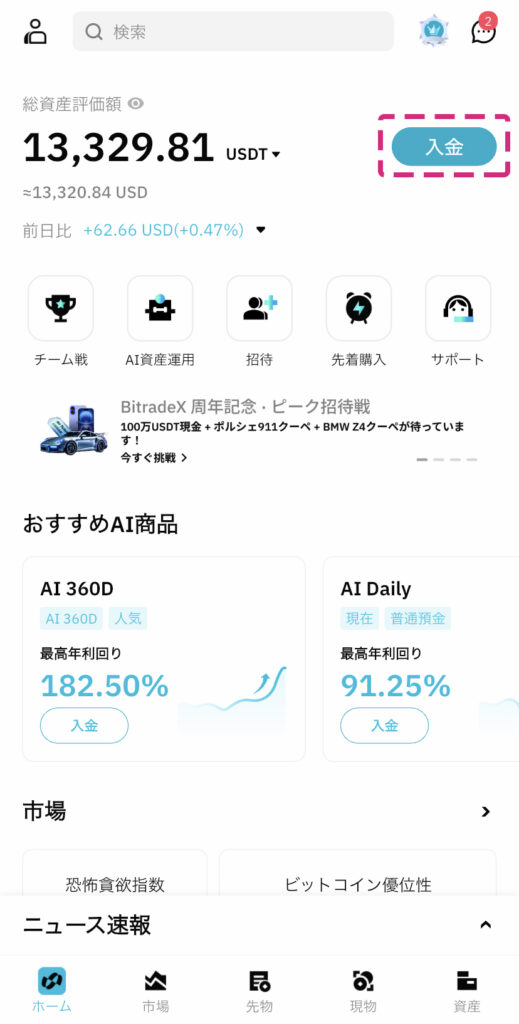 そうでない場合は、ホーム画面右上の“入金”ボタンをタップしてください。