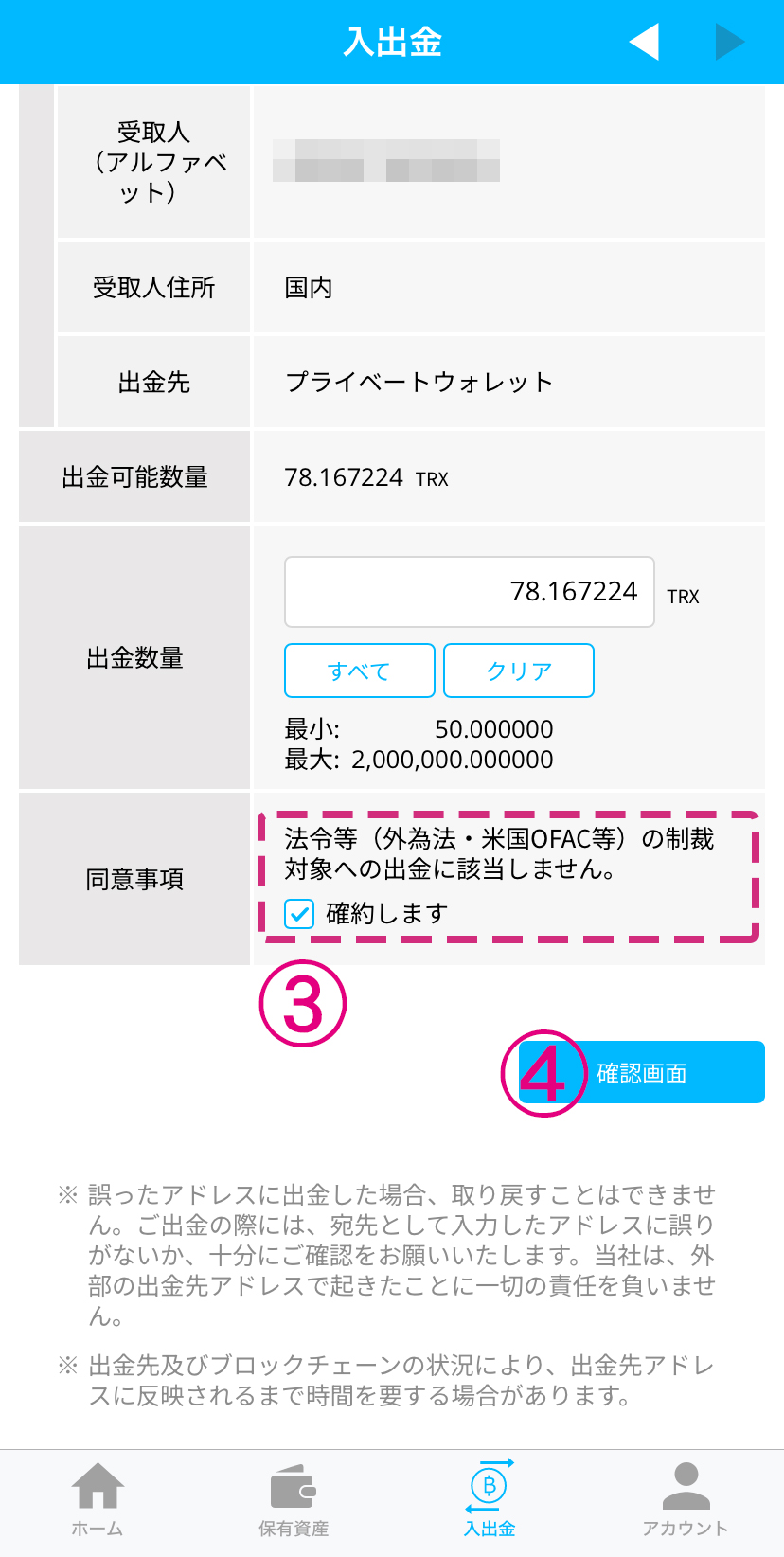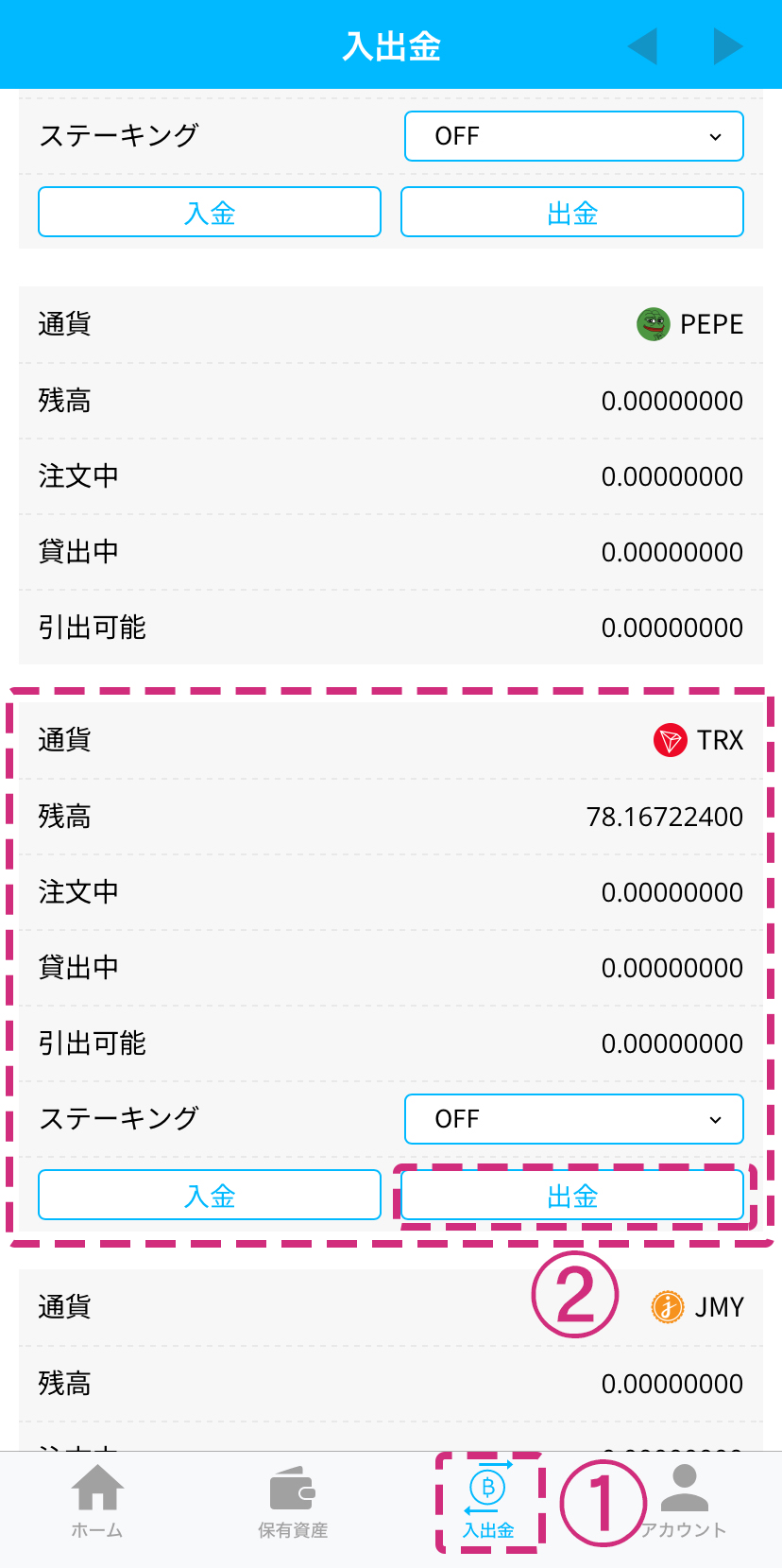 ② 画面をスクロールし、TRX項目の“出金”ボタンをタップします。