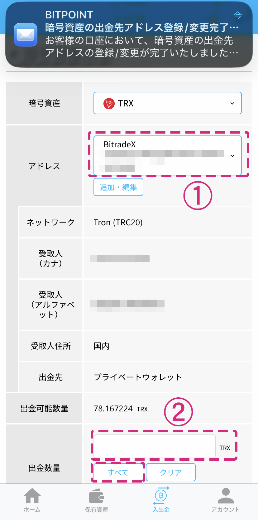 BITPOINT内で購入したTRX(トロン)をBitradeX内の自身の口座に送金する方法を解説いたします。