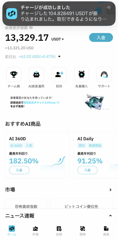 入金が反映されると、BitradeXアプリに通知があり、同時に入金完了メールが届きます。