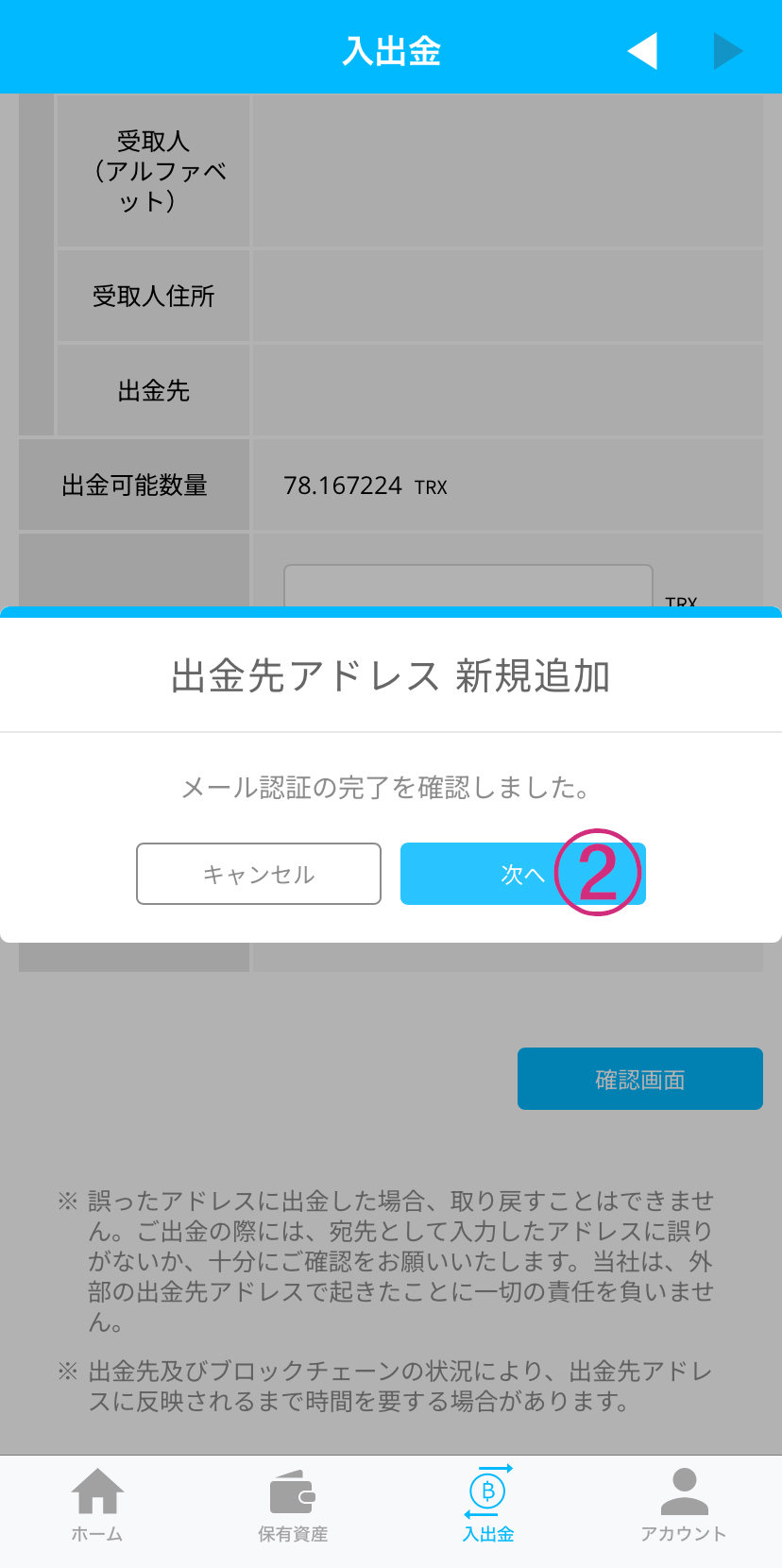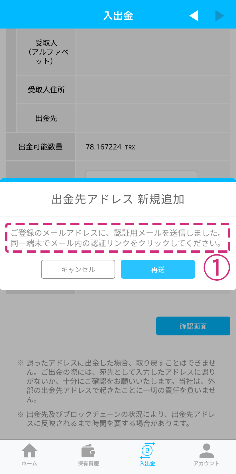 ① 一度登録した送金アドレスは、2回目以降はここで選択するだけでOKです。