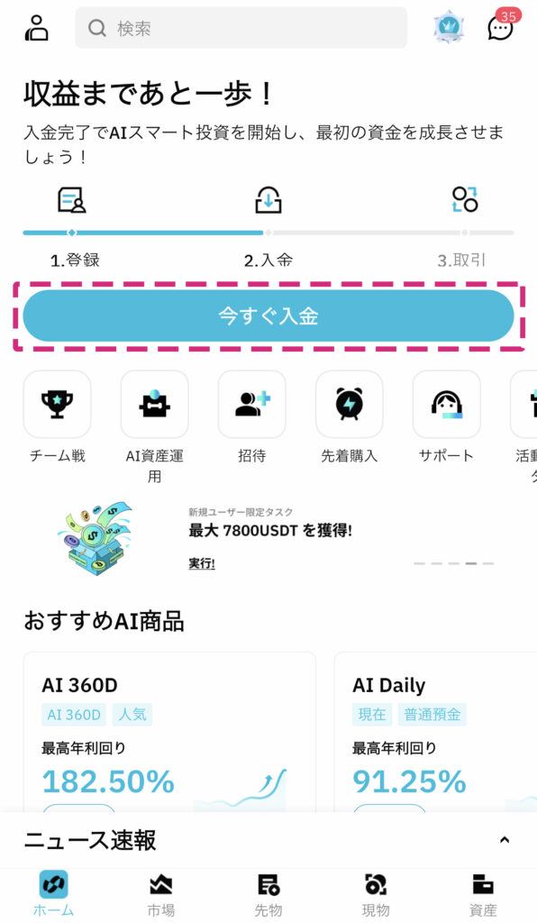 初回ログイン時であれば、ホーム画面の“今すぐ入金”ボタンをタップします。