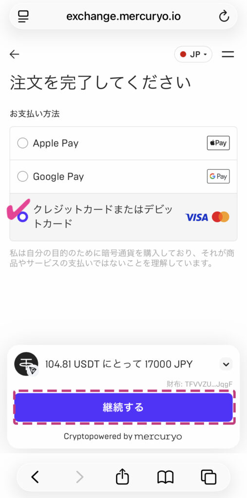支払い方法にデビットカードを選択し、“継続する”をタップします。