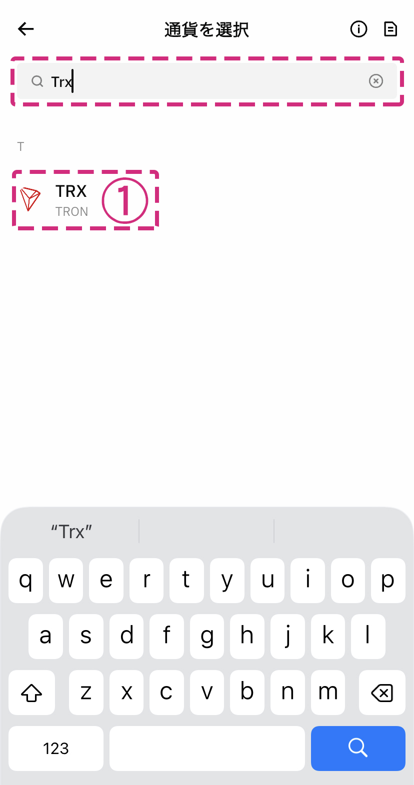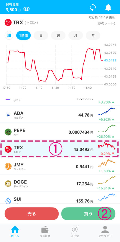 ① ホーム画面をスクロールさせて、暗号資産一覧から“TRX(トロン)”を選択します。