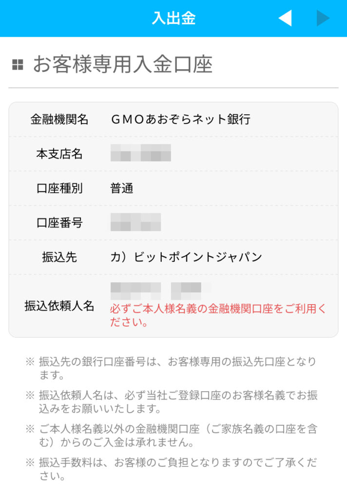 - 振込依頼人がアカウントに登録した名前と一致している必要があります。
