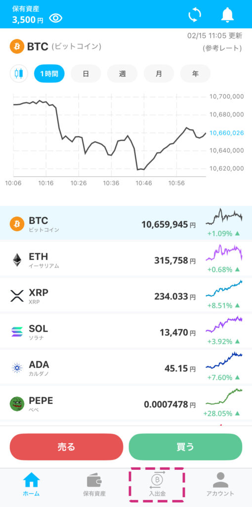 BITPOINTアプリを立ち上げ、ホーム画面下の“入出金”をタップします。