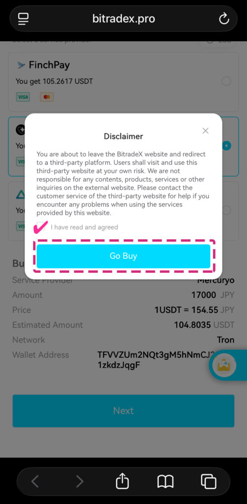同意項目にチェックを入れ、“Go Buy”ボタンをタップします。
