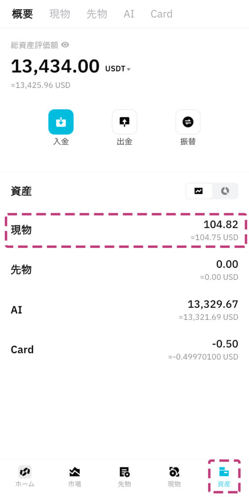 アプリの“資産”を確認すると、“現物”資産に入金したUSDTが反映されているのが確認できます。