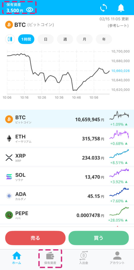 BITPOINTアプリ内では、ホーム画面左上の“保有資産”、または画面下のメニュー内の“保有資産”をタップすると確認することができます。