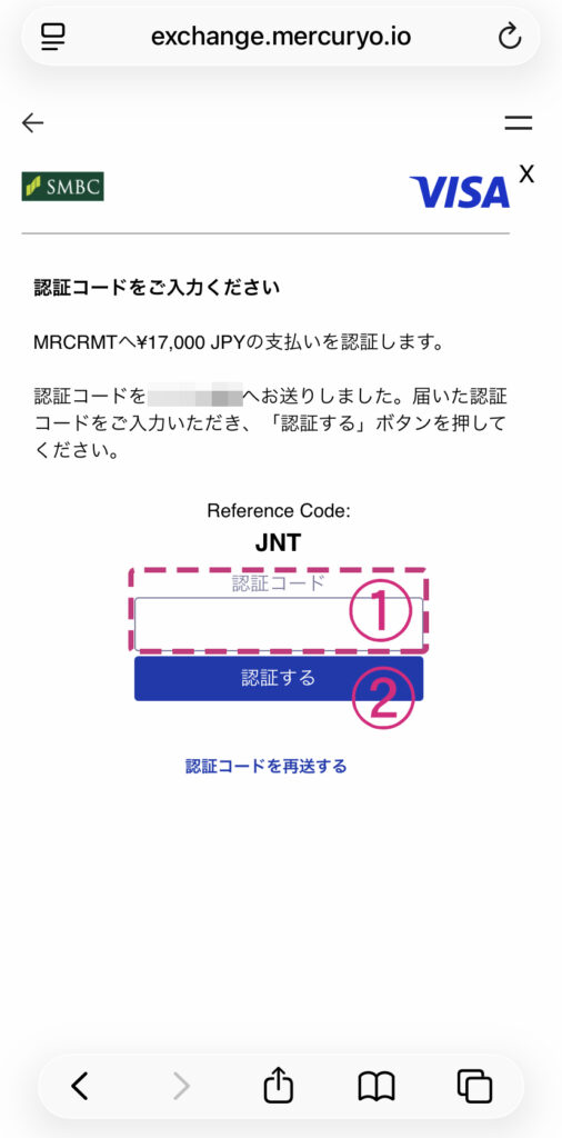 ① ショートメッセージに送信された認証コード(6桁の数字)を入力します。