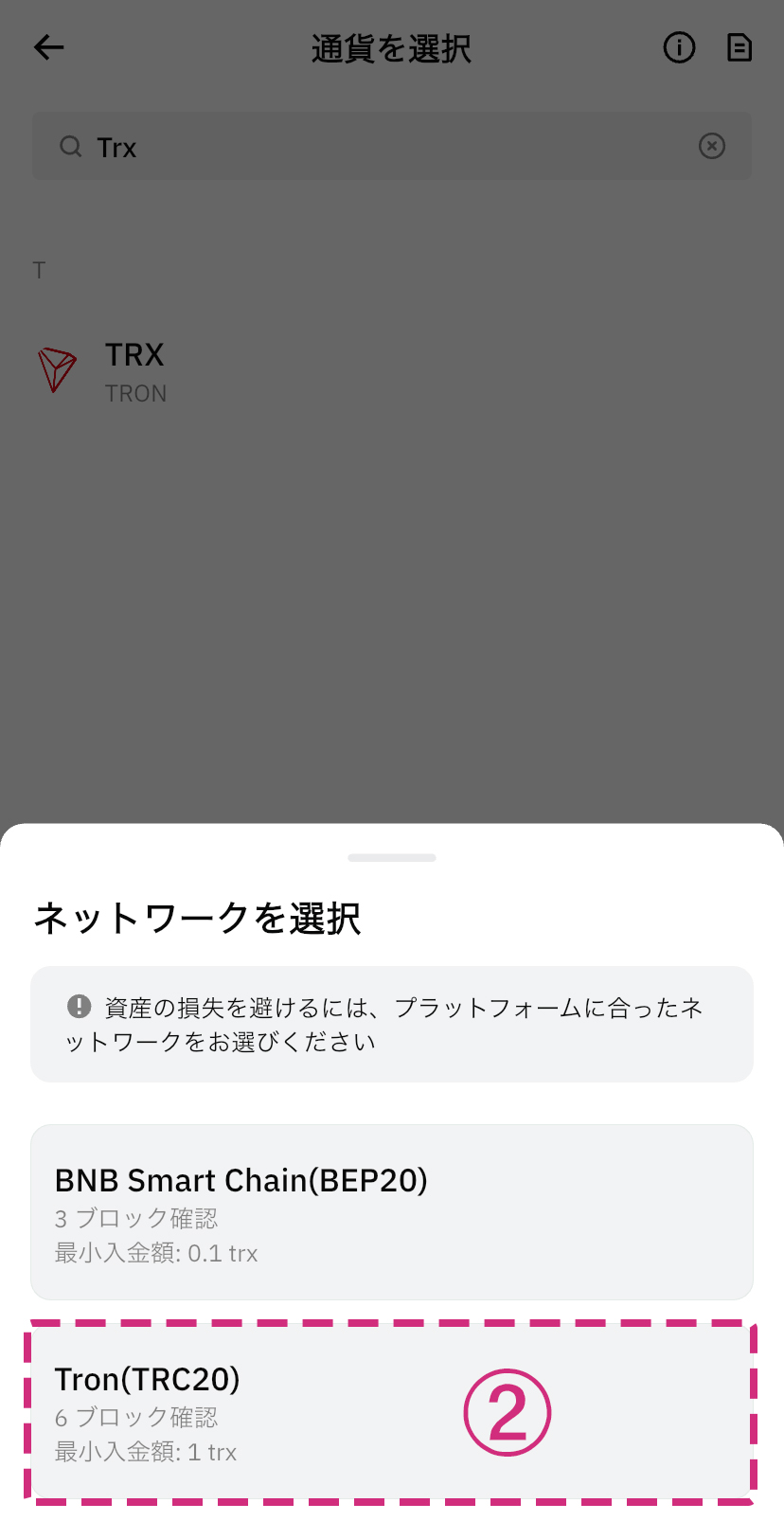 ② 送金ネットワークに“Tron(TRC20)”を選択します。